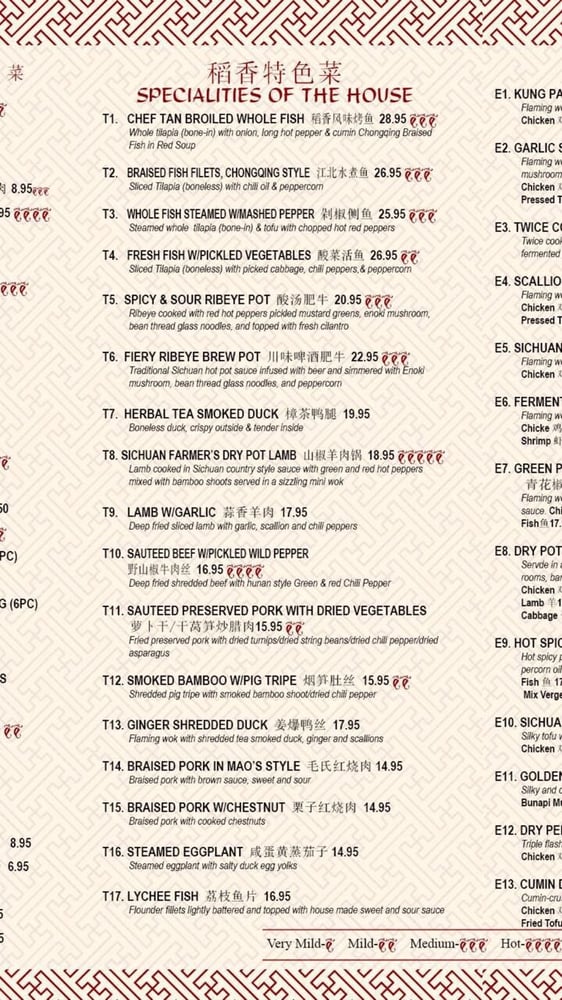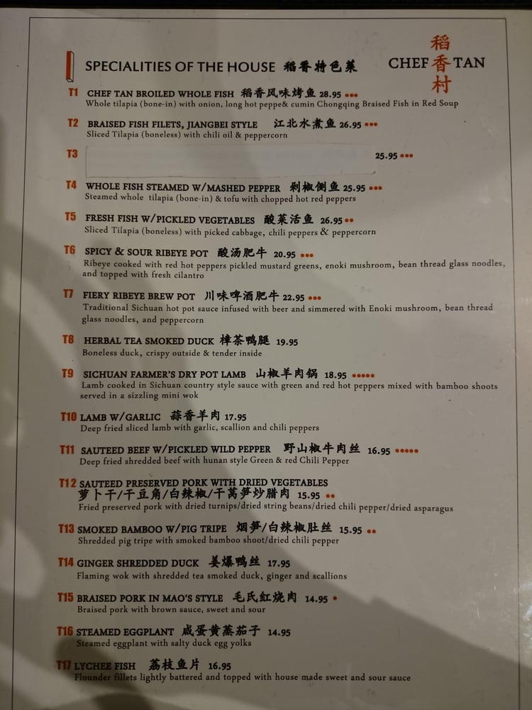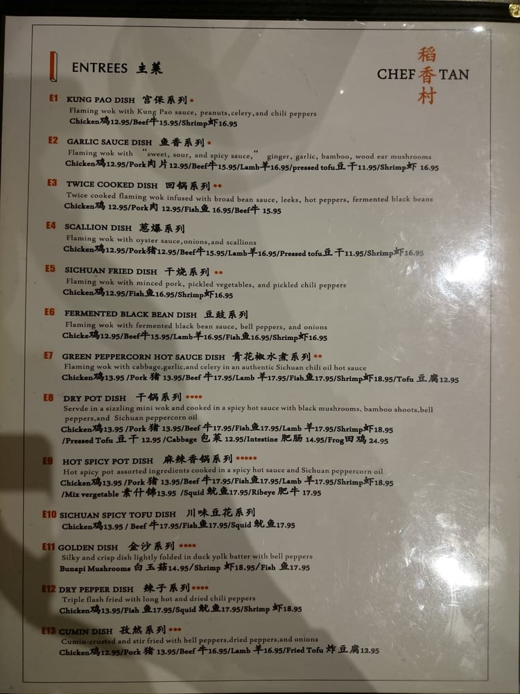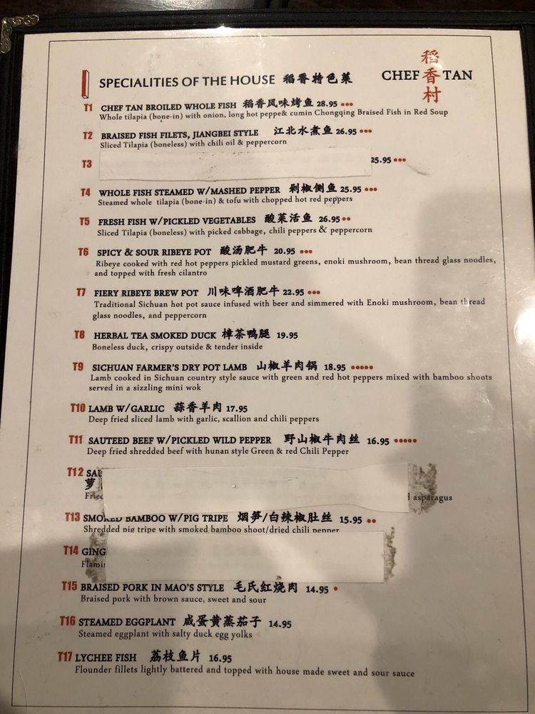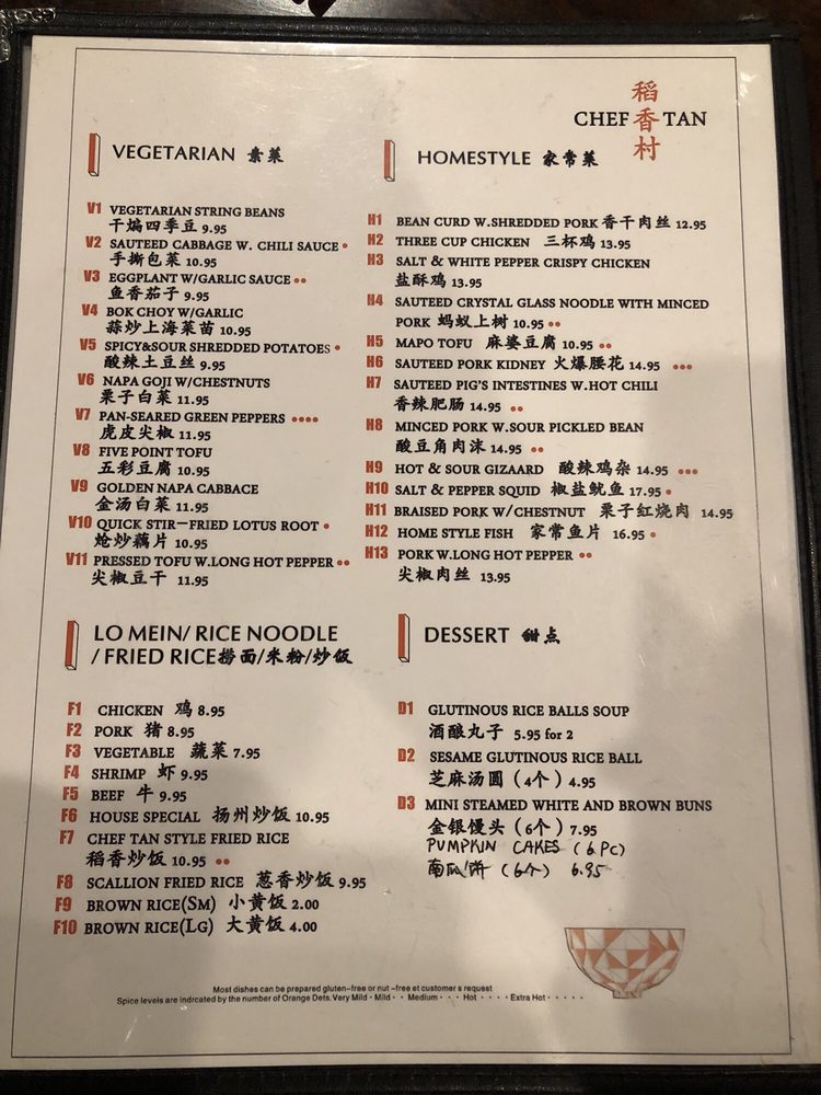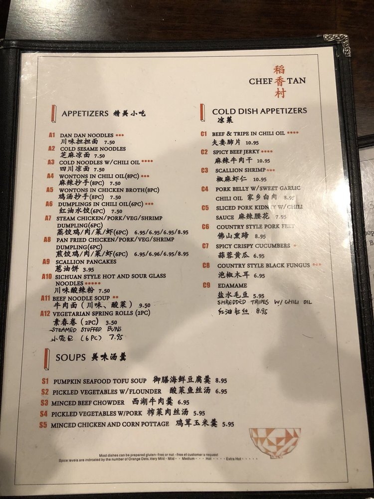Introducing the menu at CHEF TAN, a Chinese restaurant located at 108 E Main St Newark, DE 19711. They offer a variety of cold dish appetizers like Beef and Tripe in Chili Oil, Chicken with Chili Sauce, and Spicy Crispy Cucumbers. Their appetizers include Dan Dan Noodles, Cold Sesame Noodles, and Wontons in Chili Oil. For soups, they serve Pumpkin Seafood Tofu Soup and Minced Chicken and Corn Pottage Soup. Customers rave about the authenticity of the dishes, with options not commonly found elsewhere. Standout items like Chef Tan's whole tilapia and Szechewan Wonton have received high praise for their delicious flavors. The restaurant also offers delivery, takeout, and catering services, making it a convenient choice for those craving tasty Chinese cuisine. Experience the unique flavors and exceptional service at CHEF TAN for a memorable dining experience.